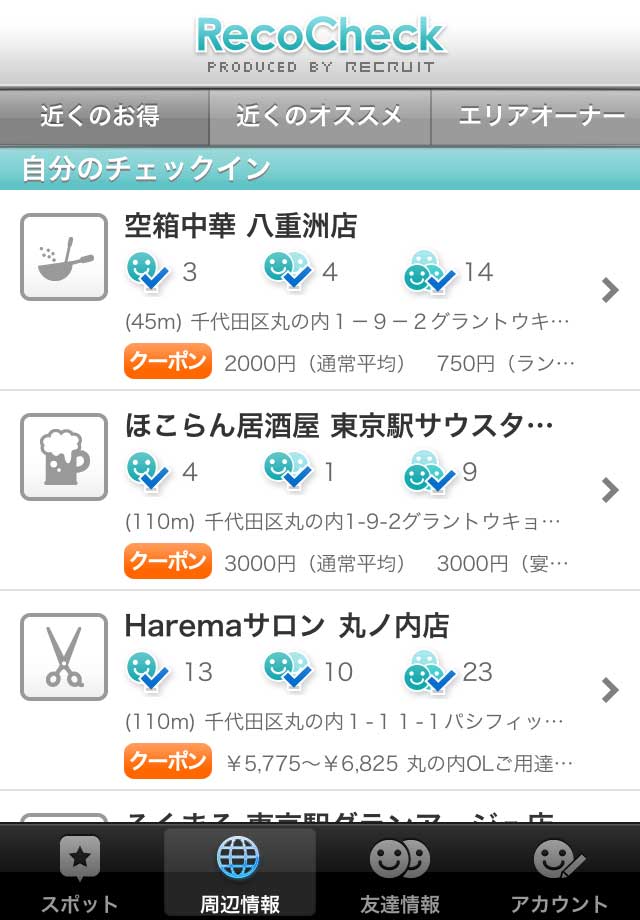 リクルートがソーシャル位置情報サービス参入、iPhoneアプリ「RecoCheck」