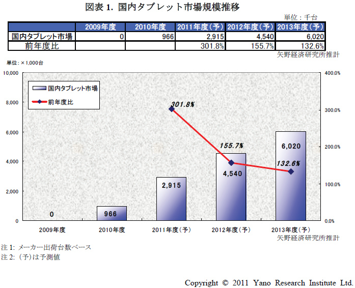 矢野経調査、2010年度の国内タブレット出荷台数は96万6000台