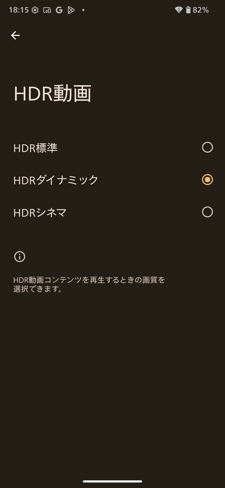 HDRの画質は、ディスプレイ設定から「HDR標準」「HDRダイナミック」「HDRシネマ」の3パターンから選べる。ディスプレイの輝度を最大にして、「HDRダイナミック」設定で視聴してみた。