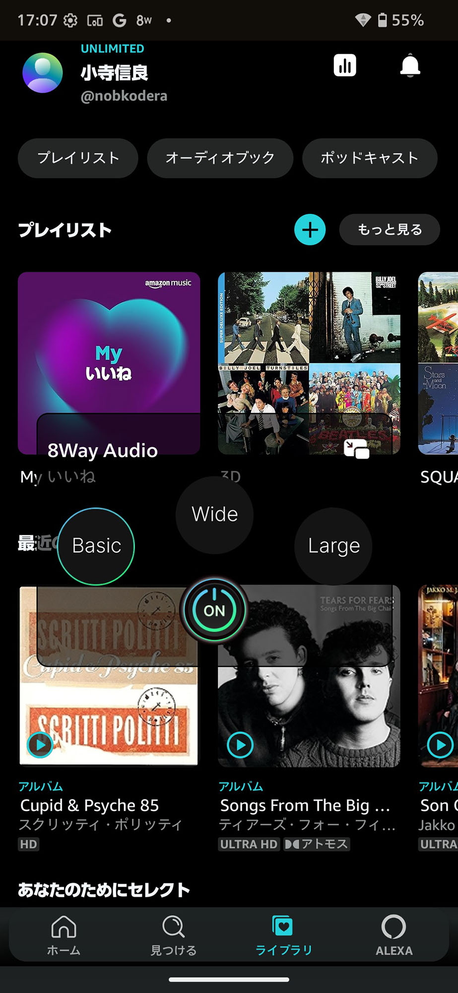 効果としては「Basic」「Wide」「Large」の3パターンがある。まず、OFFから「Basic」に切り替えると、左右に定位している音が50cmほど後ろに下がったあと、こっちに振り返るような広がり方をする。
