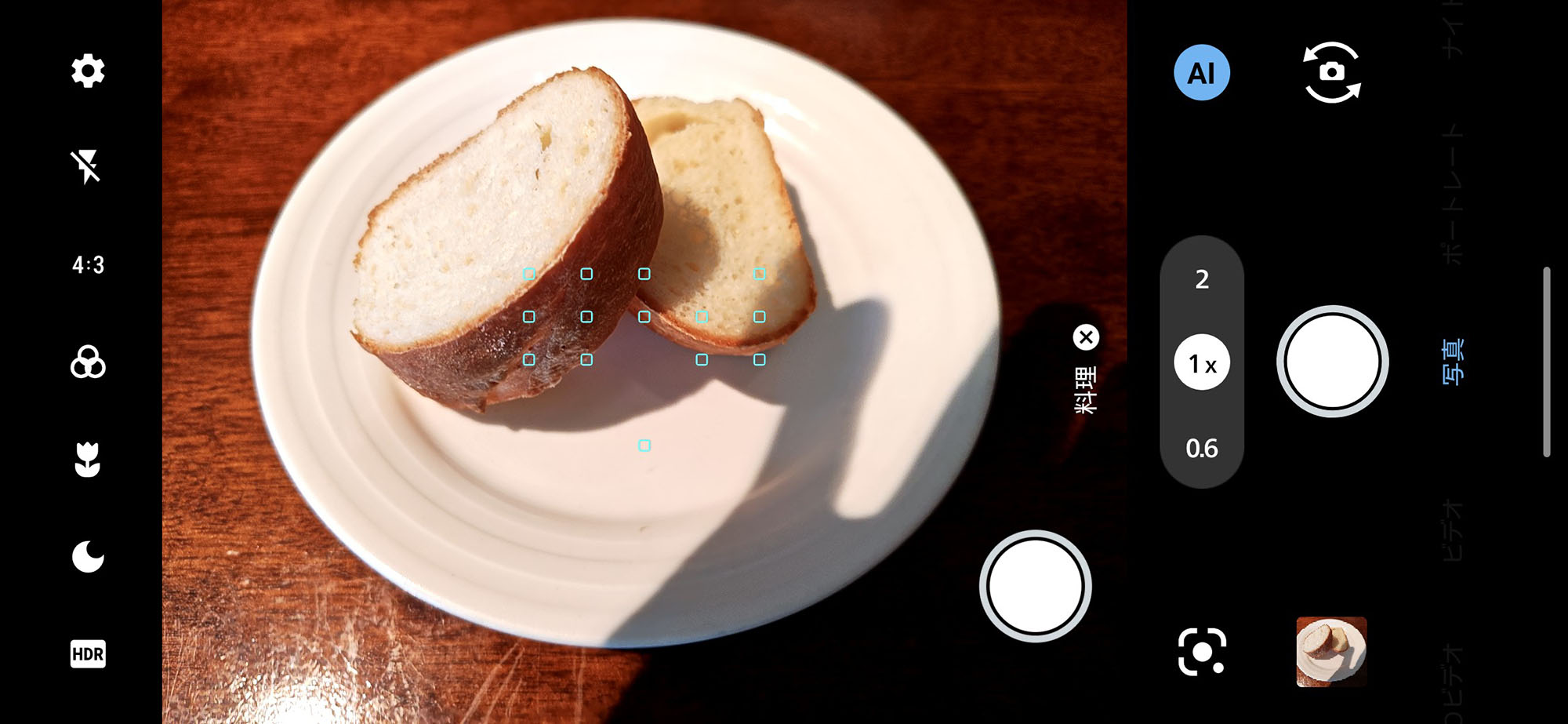 AIが被写体を見分けている。パンだけでも料理と判断している