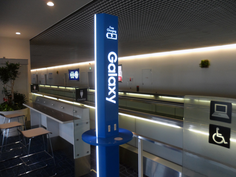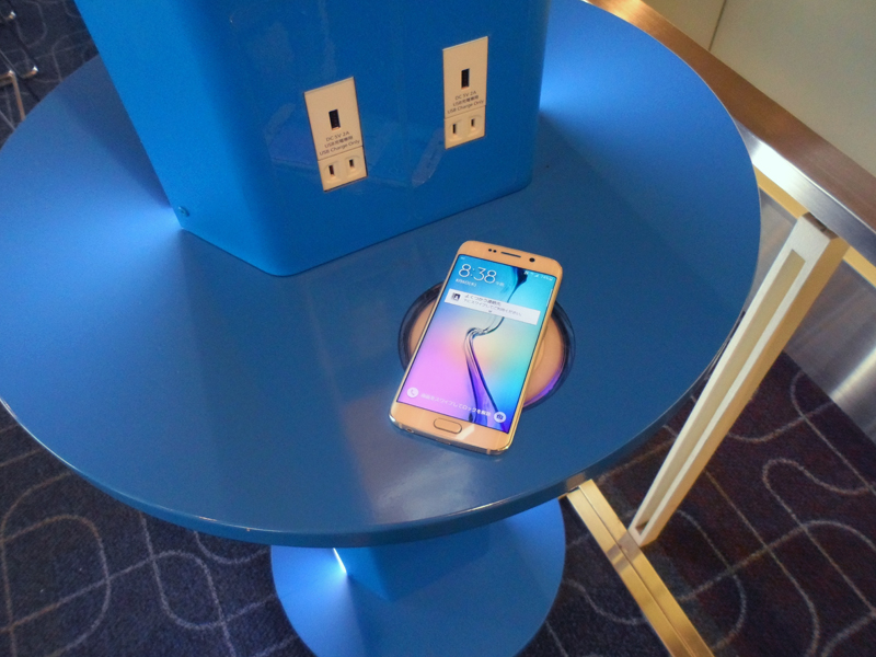 出発ゲートラウンジで見つけたのが、Galaxyの「モバイルチャージングステーション」。このチャージングステーションは、羽田空港の国内線・国際線の出発ゲートラウンジに複数設置されており、Galaxyシリーズをはじめとするスマートフォンをいつでも充電可能だ。しかも、ワイヤレスチャージャーが用意されているので、Qi規格のワイヤレス充電に対応したGalaxy S6 edge/Galaxy S6であれば、置くだけで充電ができる。USBケーブルなどをわざわざバッグから取り出すことなく、ワイヤレスで手軽に充電できるのは便利であり、今回のように充電せずに空港まで来てしまったときには重宝するはずだ。