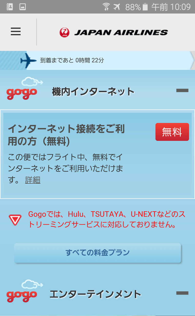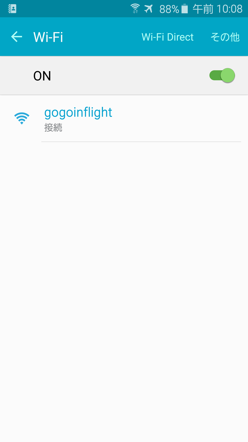 飛行機に乗ったら、Galaxy S6 edgeを一旦、機内モードへ。JAL SKY Wi-Fiは、離陸の5分後から着陸の5分前まで利用できるWi-Fiサービスとなっていて、離陸後しばらくしてアナウンスが流れたら利用開始可能の合図だ。