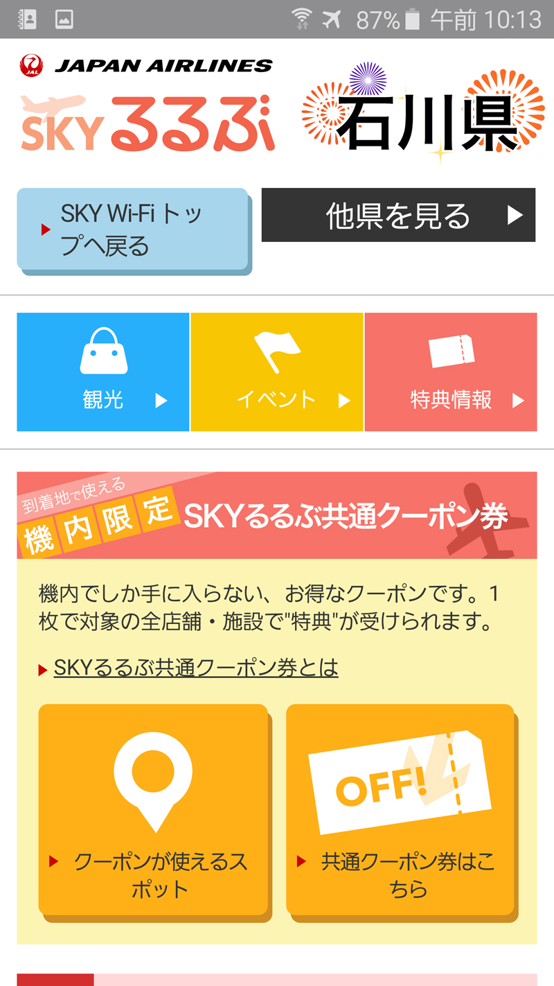 JAL SKY Wi-Fiでは、目的地の観光情報サイト「Skyるるぶ」やテレビ番組などの映像コンテンツを無料で閲覧することができ、さらに羽田〜小松線の場合、通常有料のインターネット接続サービスも無料で利用可能だ。ただし、小松までの所要時間はわずか1時間、飛行時間は30分程度なので、Wi-Fiサービスを利用できるのは20分程度。観光情報をじっくりチェックしている時間はなさそうだが、Skyるるぶでは機内限定で入手可能な共通クーポン券が用意されているので、こちらを忘れずにゲットしておくといいだろう。