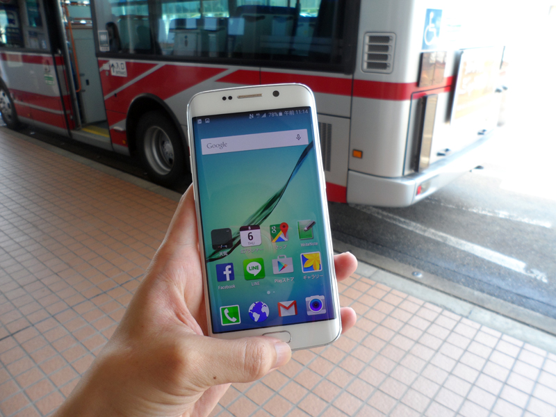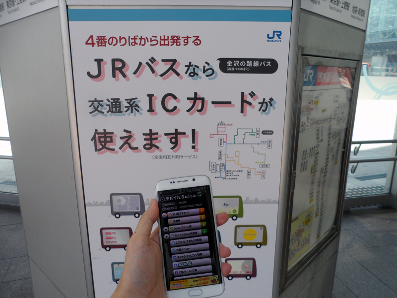 空腹を満たしたところで、いよいよ金沢観光の開始だ。まずは、バスに乗って兼六園へ向かう。金沢駅の兼六園口(東口)からは多数のバスが出ているが、運行会社は北陸鉄道バスと西日本JRバスの2種類。このうち、JRバスでは、北陸新幹線開業に合わせて交通系ICカードサービス「PiTaPa」を導入しており、Suicaとも相互利用が可能だ。ようやく、Galaxy S6 edgeのモバイルSuicaを使えるということで、喜び勇んでJRバスに乗車。小銭を使わずに運賃を支払える快適さをあらためて実感したのであった。