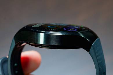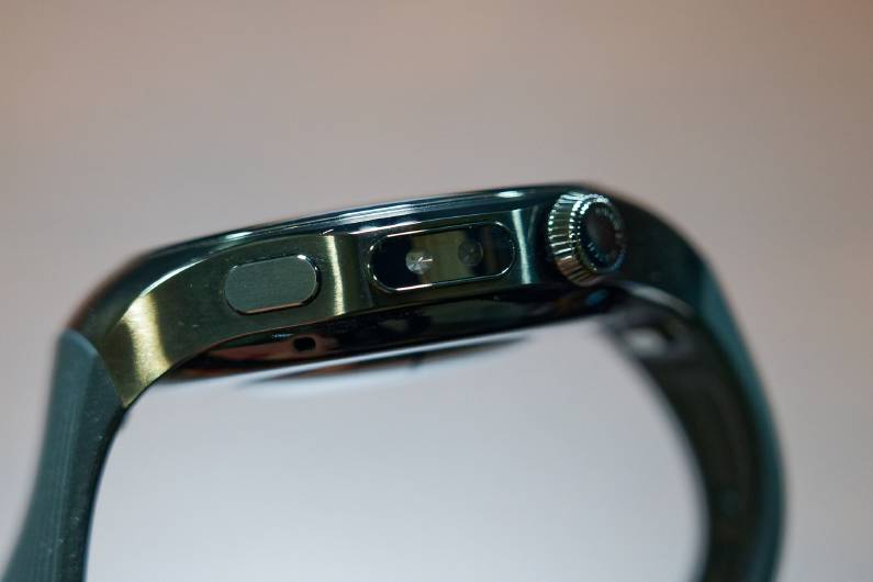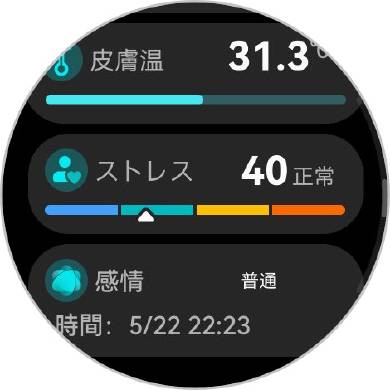 スマートウォッチだと通常は本体底面のリアケース部(装着時に肌に接する面)に心拍等計測用のセンサー類が設けられているが、それを本体側面にも搭載したのがX-TAPだ。圧力センサーを内蔵するPPG(光電式脈波記録法)センサーで、指の腹で軽く押さえるだけで関連する計測機能が即座に起動する。