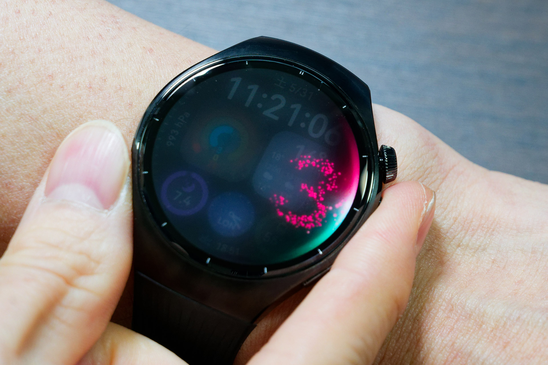 腕に装着しているHUAWEI WATCH 5に、気が付いたらなんとなく目が行って、指先で画面につい触れたくなる。その理由の1つは、きっとデザインのスタイリッシュさにあると思う。