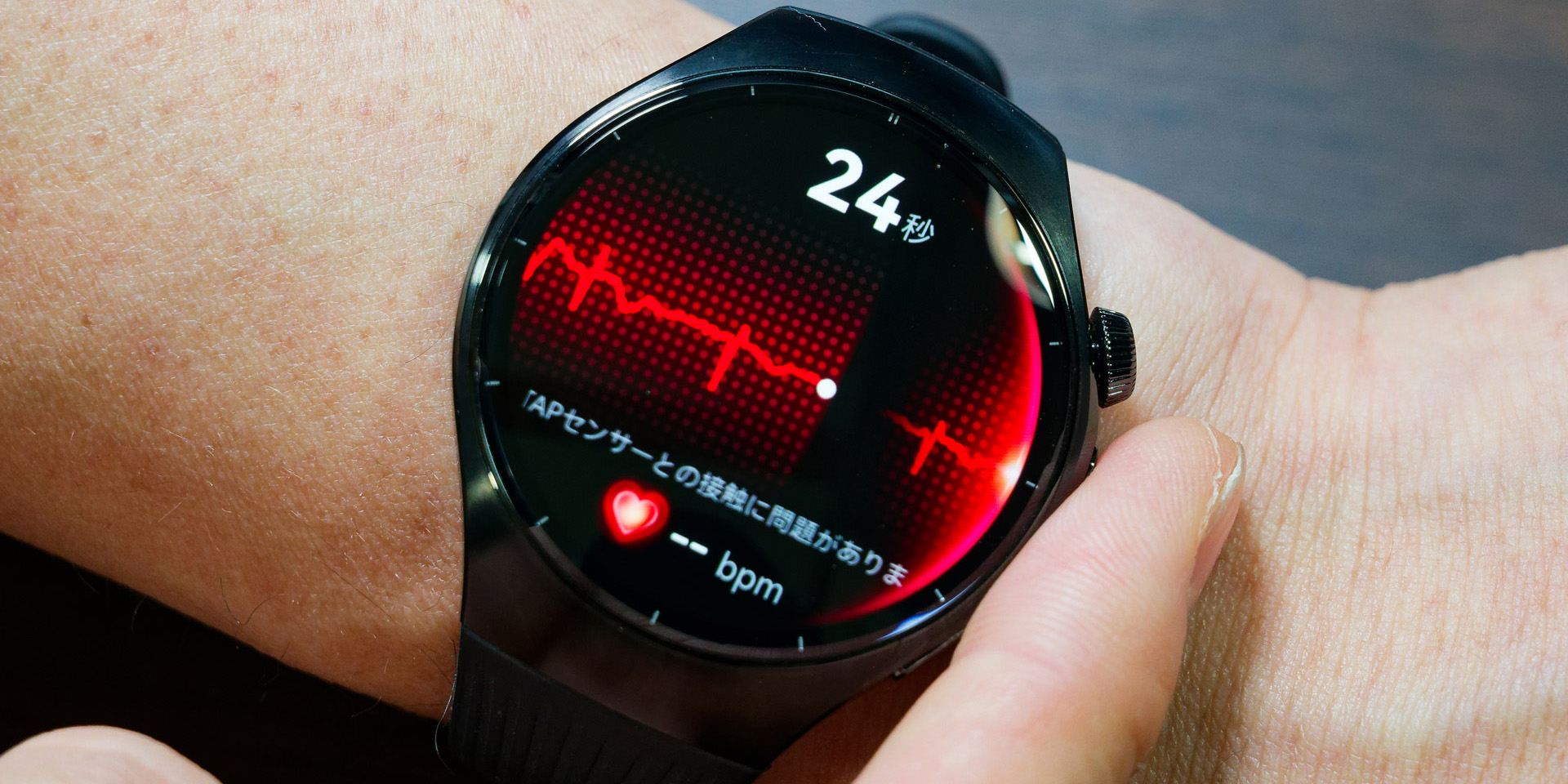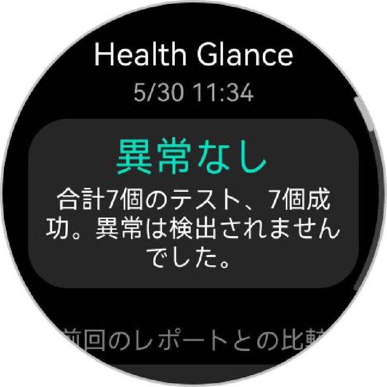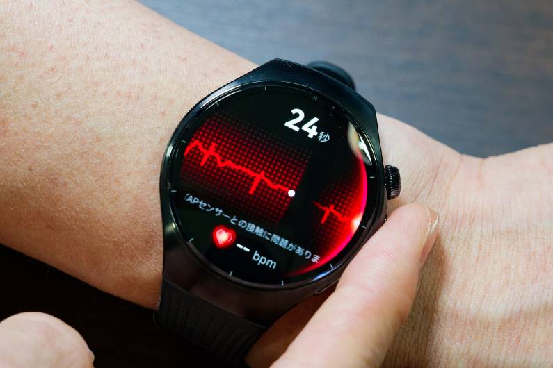 X−TAPを使うと初めに心電図の記録が始まる。HUAWEI WATCH 5の心電図アプリケーションは、日本のプログラム医療機器承認(承認番号:30600BZI00035000)を取得しており、X−TAPに30秒ほど指を押し当てるだけで異常がありそうか、なさそうかが判定される。筆者の体感ではこの30秒というのは、市販の専用心電計と同等の短さだ。