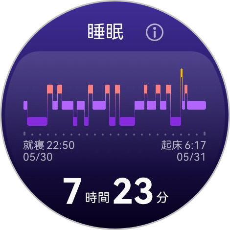 HUAWEI WATCH 5の標準モードでのバッテリー稼働時間は約4.5日とそこそこ長く、頻繁な充電は不要。就寝時(昼寝も含め)の睡眠分析にもしっかり活躍してくれる。睡眠分析する際はウォッチの操作は特に必要なく、就寝時にただ身に付けておくだけだ。