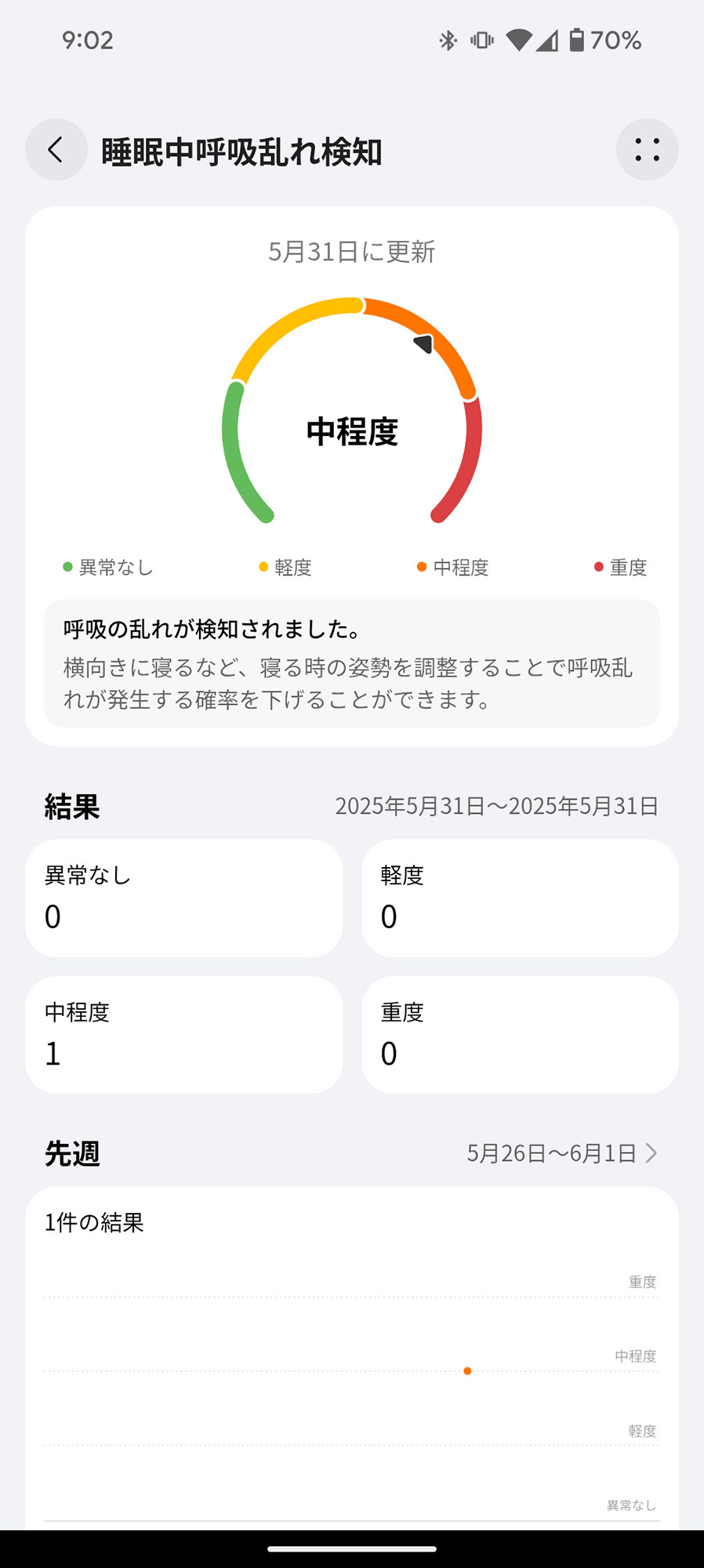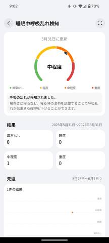起床後、睡眠の深さの推移が視覚化されるとともに、睡眠の質を点数で表し、平均の呼吸数、心拍数、血中酸素レベルなど、細かなステータスも明らかになる。睡眠データを元にした「睡眠中呼吸乱れ検知」という機能もあり、こちらは専用スマホアプリで確認できる。医療機器ではないのであくまで参考情報だが、睡眠時無呼吸症候群のような身体の不調を察知する助けになるだろう。