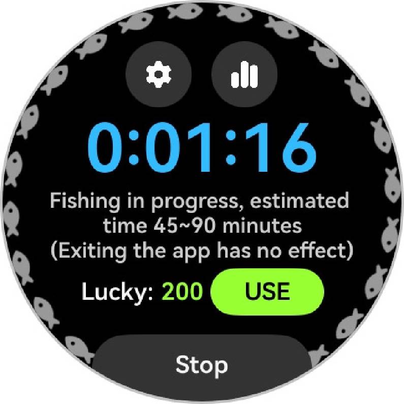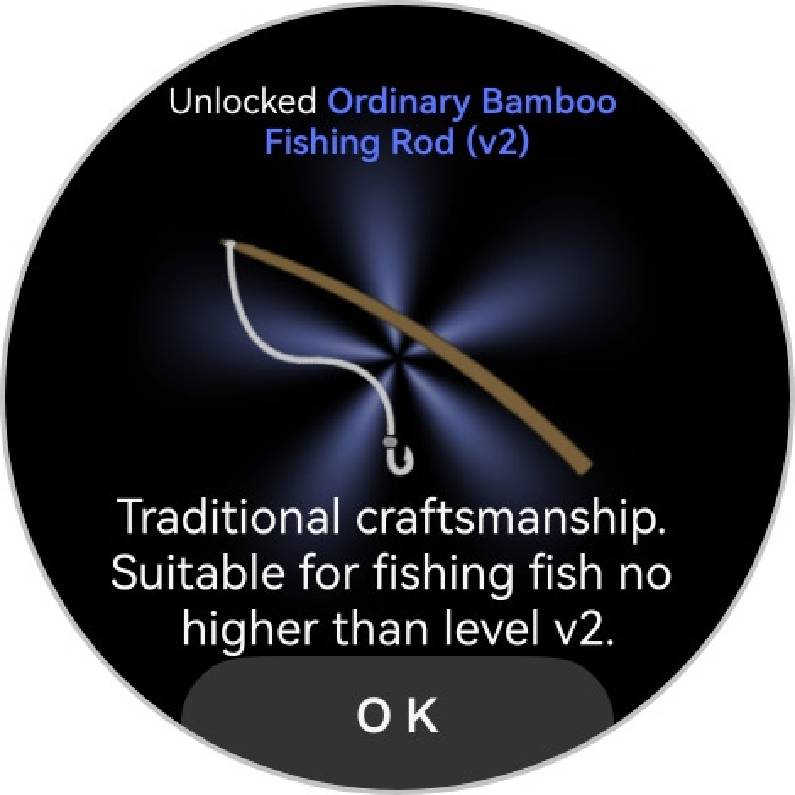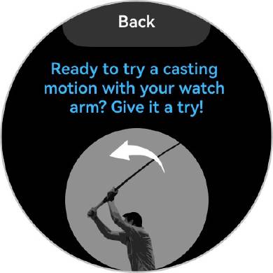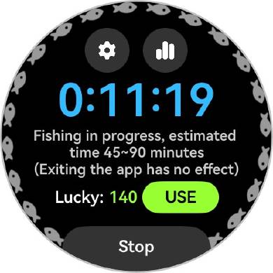 起動して釣り竿をキャストするように腕を勢いよく振ると、HUAWEI WATCH 5内蔵のセンサーがそのジェスチャーを感知して釣りがスタート。あとはゲームを気にすることなく普段どおりに過ごしていればいい。そのうちブルッとウォッチが震えて、魚が釣れたことを教えてくれる。