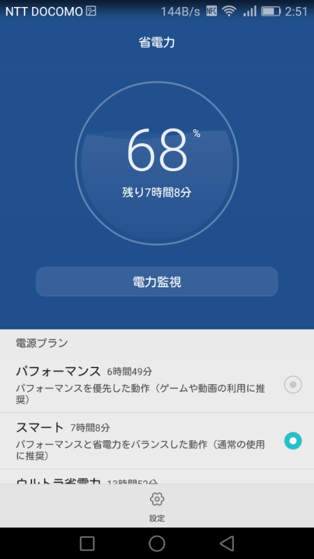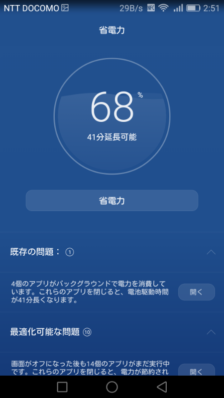 極端にバッテリーを消費するアプリが稼働している場合は、通知パネルで教えてくれるのも便利。さらに設定の「省電力」を使うと電力監視が可能で、利用時間を延長できるよう問題点を指摘してくれるからありがたい。ときどきチェックしておくと、メモリもスッキリしてよさそうだ。