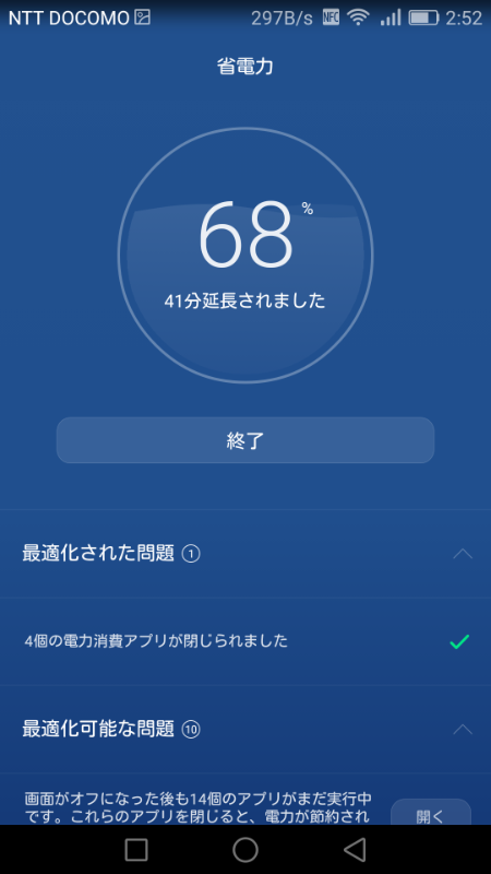 問題点が洗い出される。「省電力」ボタンをタップすると、問題点がすべてクリアされる