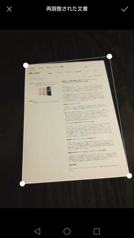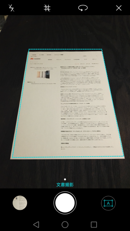 しかし、これだけではないのが「HUAWEI Mate S」。ぜひ活用したいのが「文書撮影」モードだ。これは書類やノート、ホワイトボードのエッジを自動的に検出し、傾きや台形補正したうえで保存できるモード。起動すると「分析中…」という表示が現れ、認識されると自動的にシャッターが切れる。文書撮影モードなら、自分でシャッターを切っても撮影後に無駄な部分はカットしたうえで保存してくれるし、手動での範囲指定もできるから、メモを撮る時間が無い、筆記用具が間に合わないというシーンで威力を発揮することは間違いないだろう。