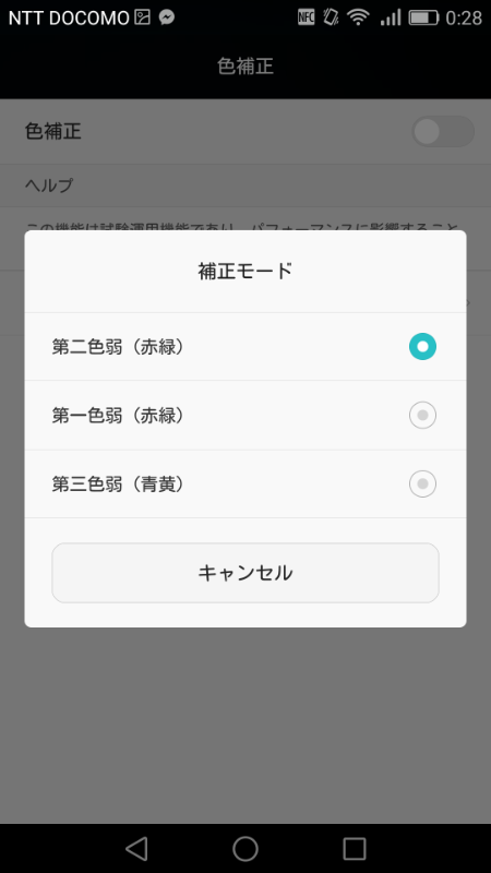 [ユーザー補助]で設定できる色補正機能。試験運用機能のため、パフォーマンスに影響があるとの注意書きはあるが、こういう配慮はさすがである