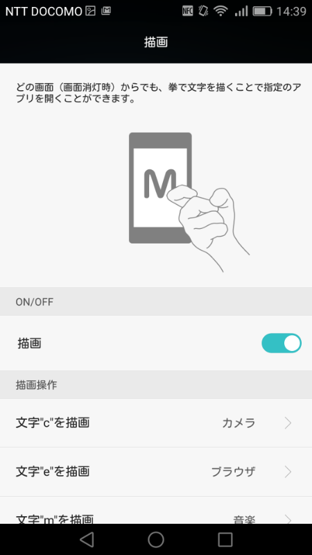 画面消灯状態で文字を描き、指紋センサーに指をおけば、指定アプリをいきなり起動できる。指先で同じことをしても認識されない